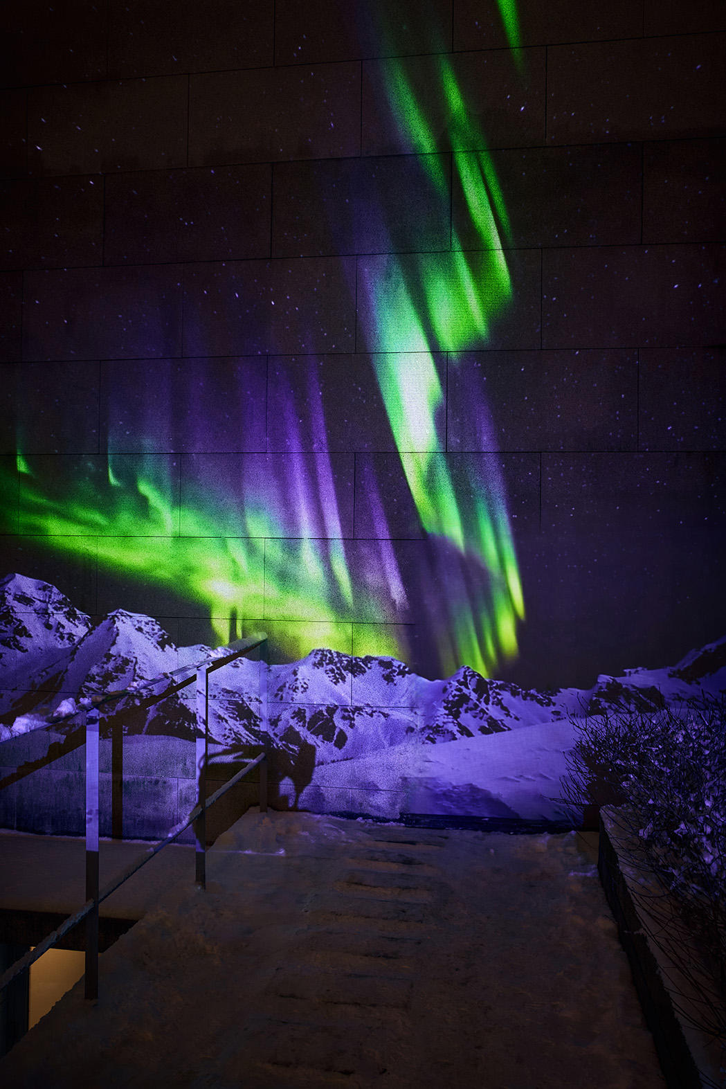 フロアを結ぶ屋外階段には、オーロラを想起させる柔らかな光が差し込み、ゲストを次のゾーンへ静かに誘いました。繊細に移ろう色彩は、ヘリテージから再解釈へとつながる「進化」のテーマを映し出し、空間と空間の間に穏やかな余韻をもたらします。シンプルでありながら印象的な演出は、体験全体の中で静かなハイライトとなりました。