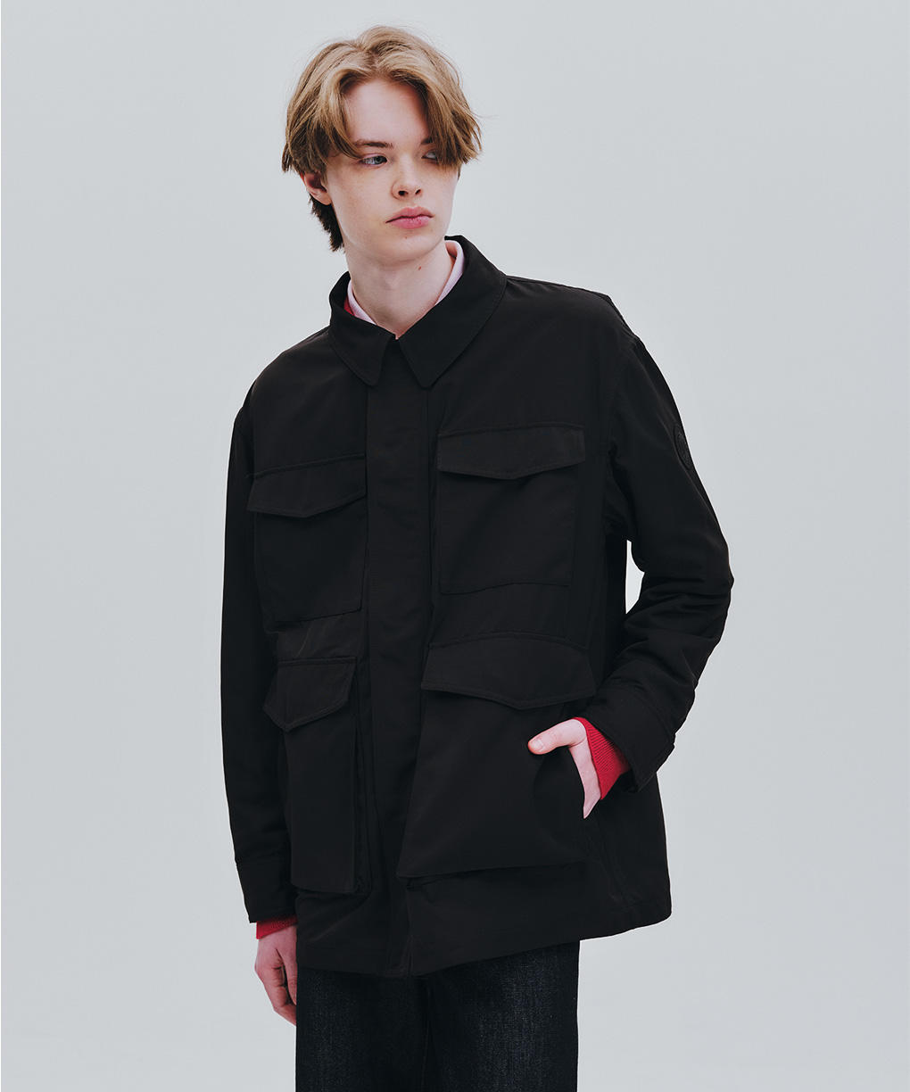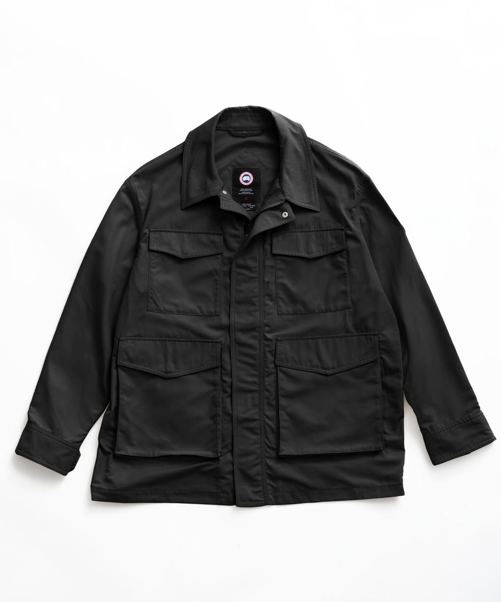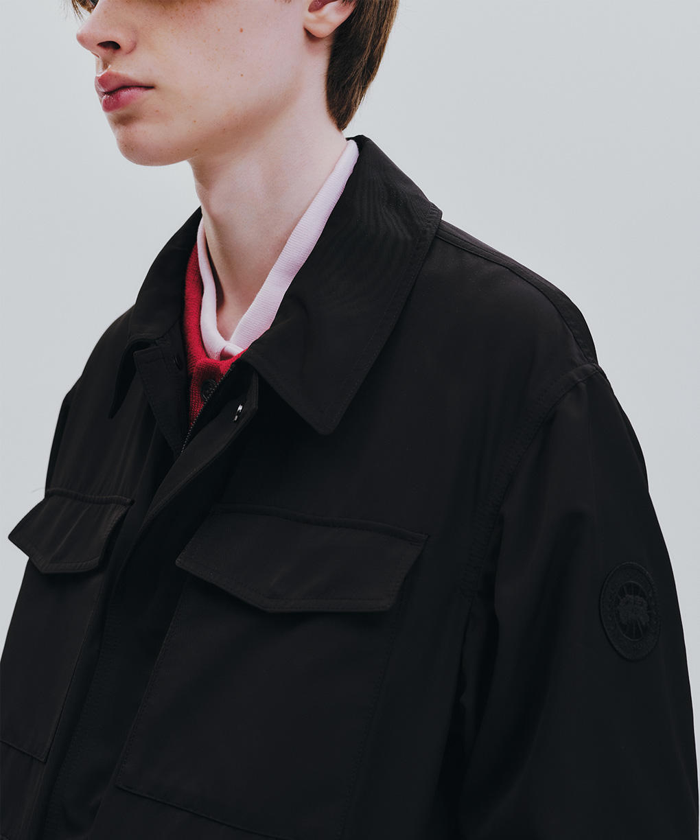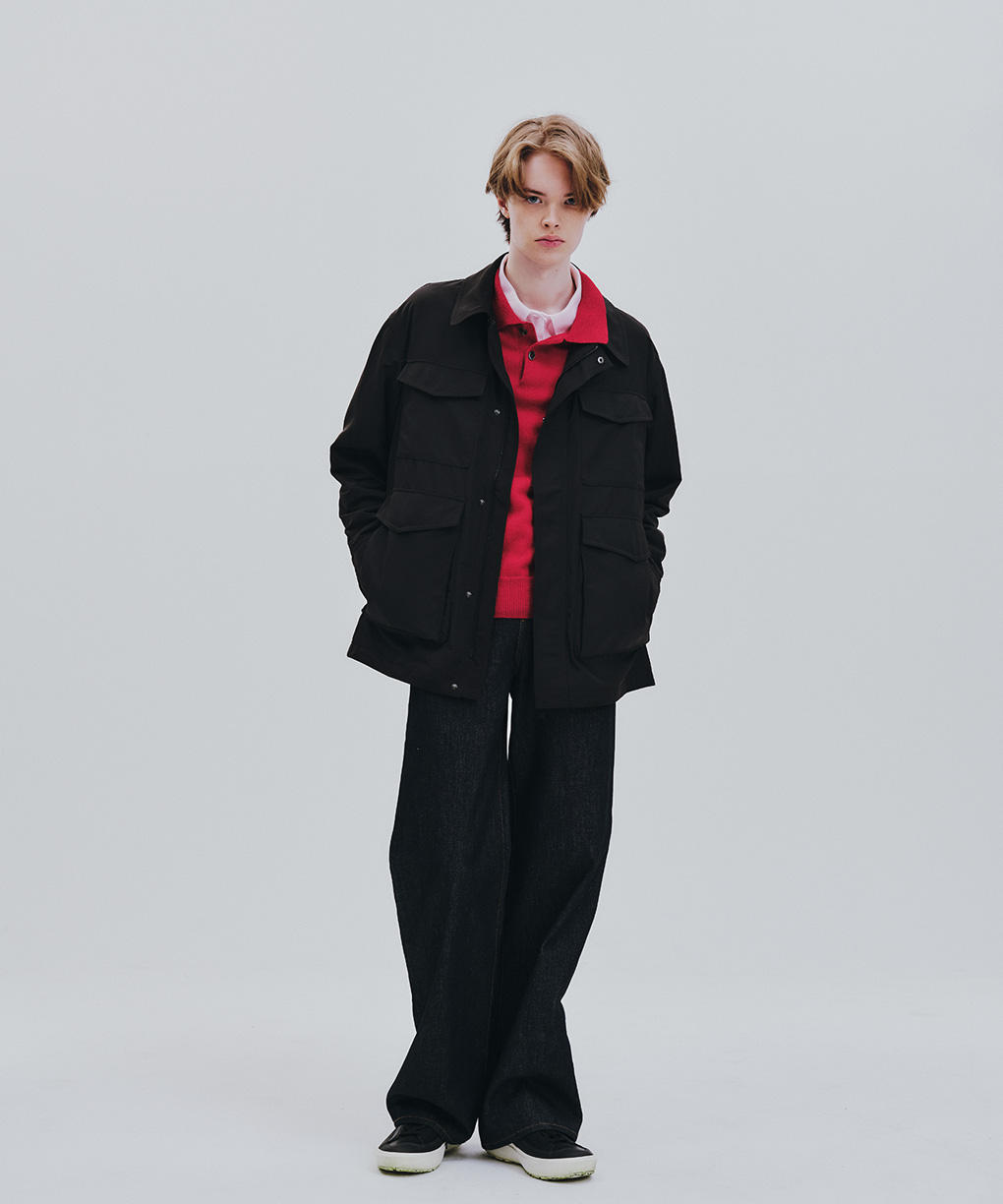 「エルマーニ ジャケット」は、M-65のディテールを着想源に、現代的な解釈で再構築。オーセンティックなユーティリティの骨格を保ちながら、よりクリーンで洗練された素材感へと昇華しました。ヒップまで届くミッドレングスは、ショート丈が主流の流れの中であえて提案するバランス。装いに奥行きを与えます。