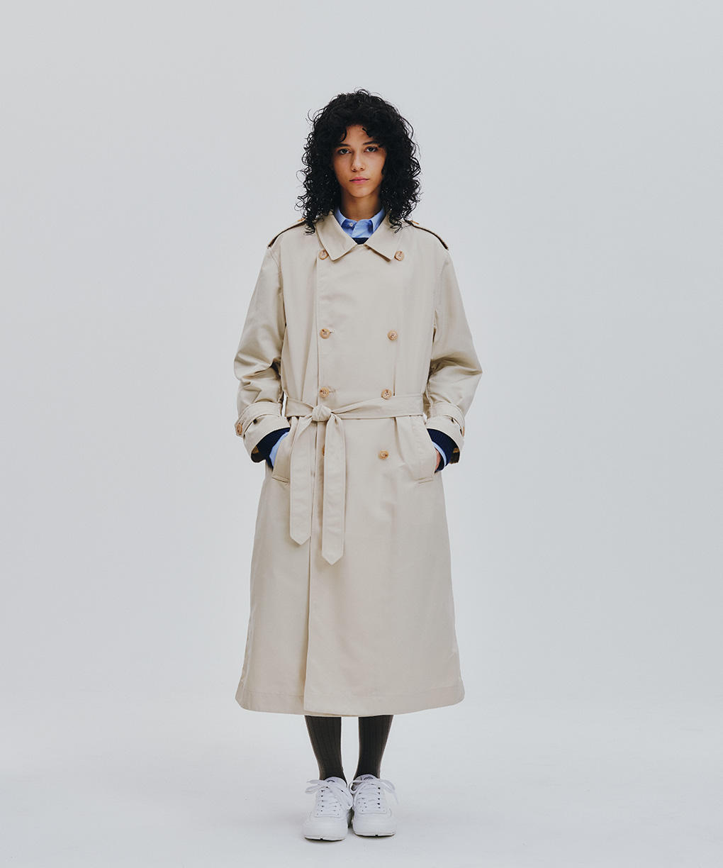 取り外し可能なベルトとダブルブレストのフロントは、着こなしに合わせてシルエットに表情をもたらします。裏地を省いた軽やかな仕立ては、歩くたびに柔らかく揺れるドレープを生み、自然な陰影が装いに奥行きを添えます。また、バックベントが動作を妨げず、袖口のボタンで手首に軽くフィットさせることも可能です。フロントのウェルトポケットには補強を施し、見た目の端正さを保ちながら日常の実用性にも配慮しました。
