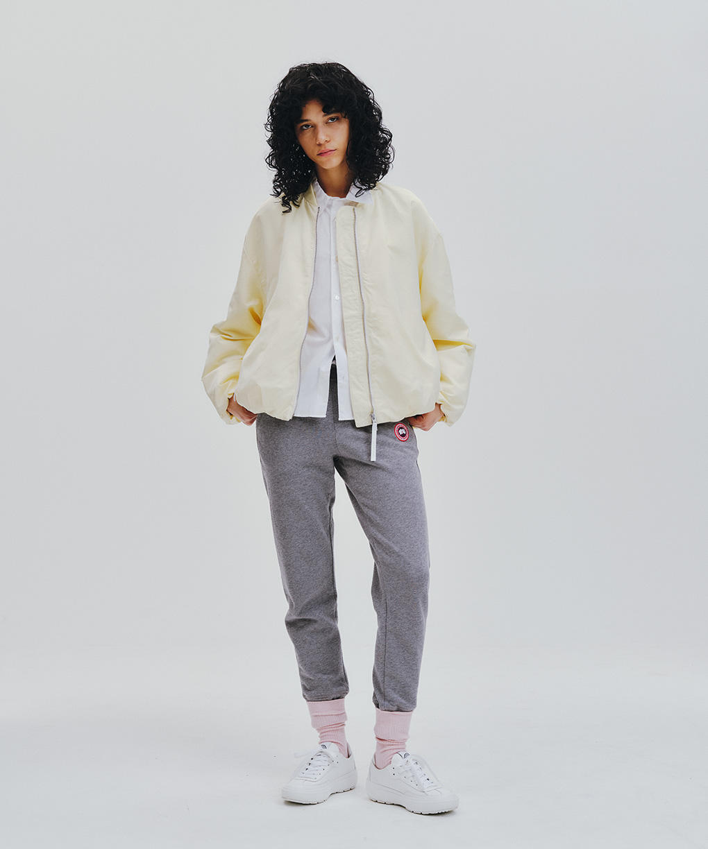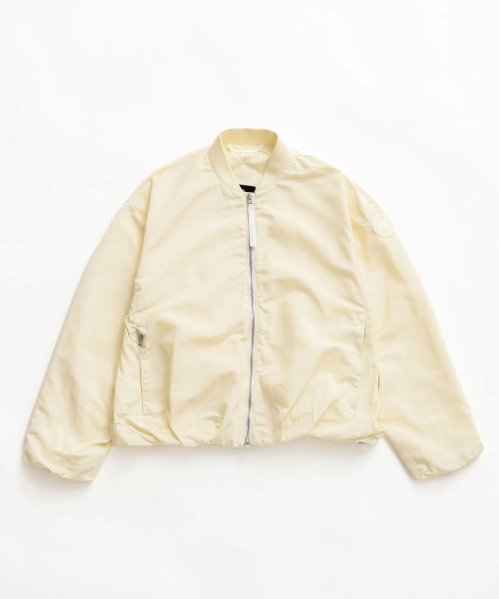 裏地を備え、裾と袖口にはゴム仕様を採用しました。自然なボリュームが生まれ、立体的なシルエットを描きます。裾内側のドローコードを調整することでフォルムに変化をつけることができ、スタイリングにさりげないリズムを加えます。リブ仕様の襟やドロップショルダーが抜け感を生み、ジッパー付きのインシームポケットがミニマルな印象を保ちながら実用性を支えます。