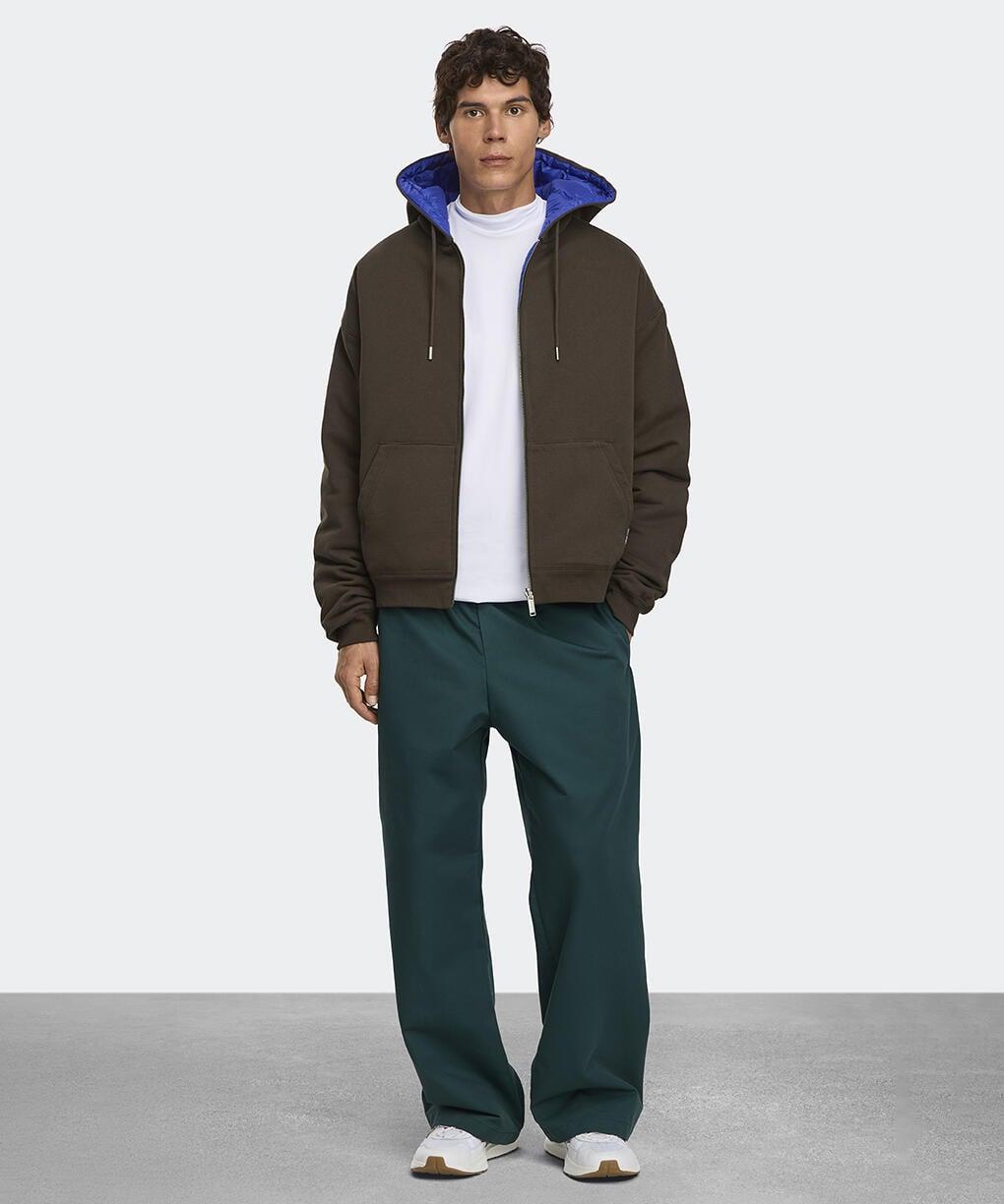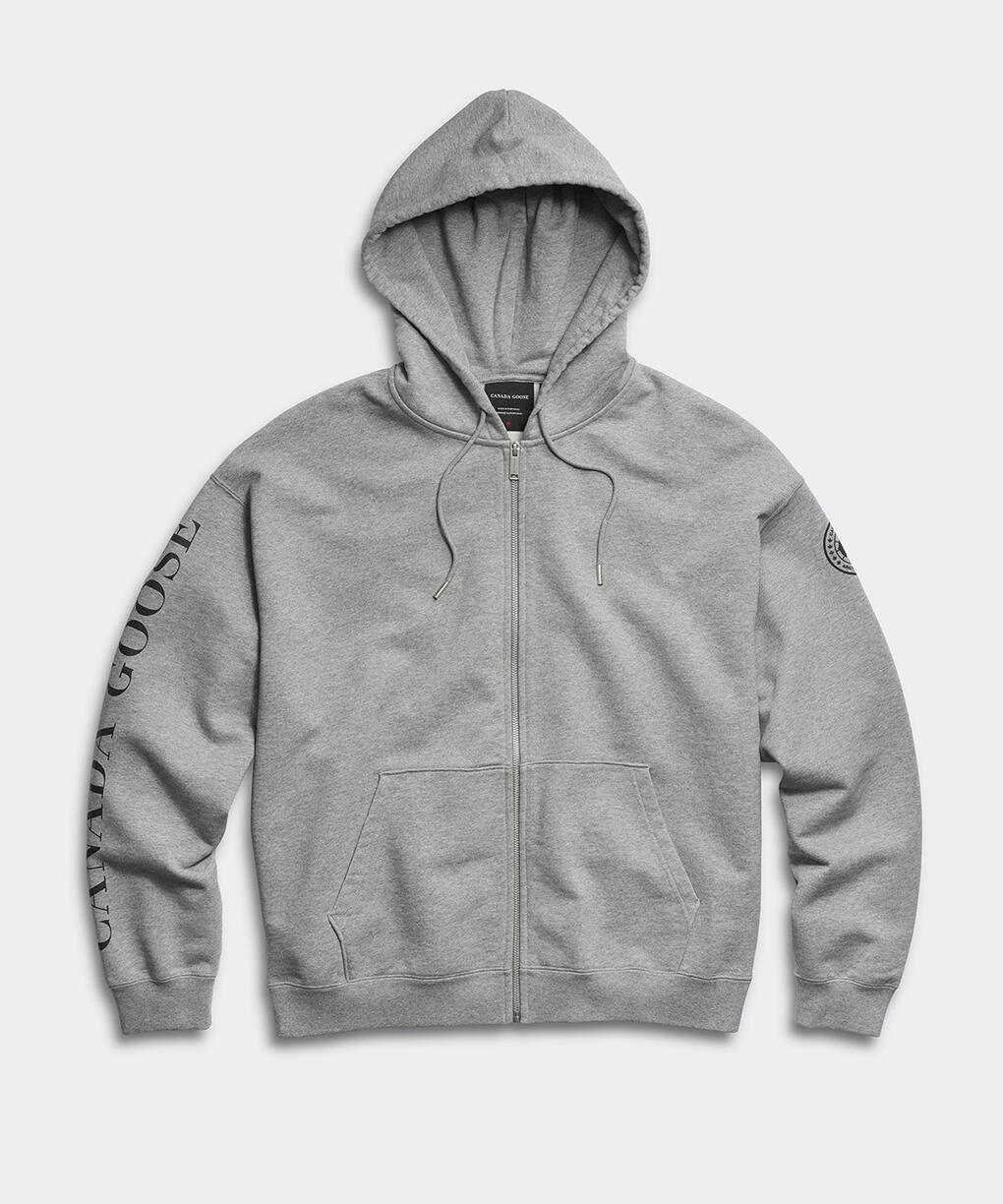 グレーのフルジップパーカが全体を中和し、
